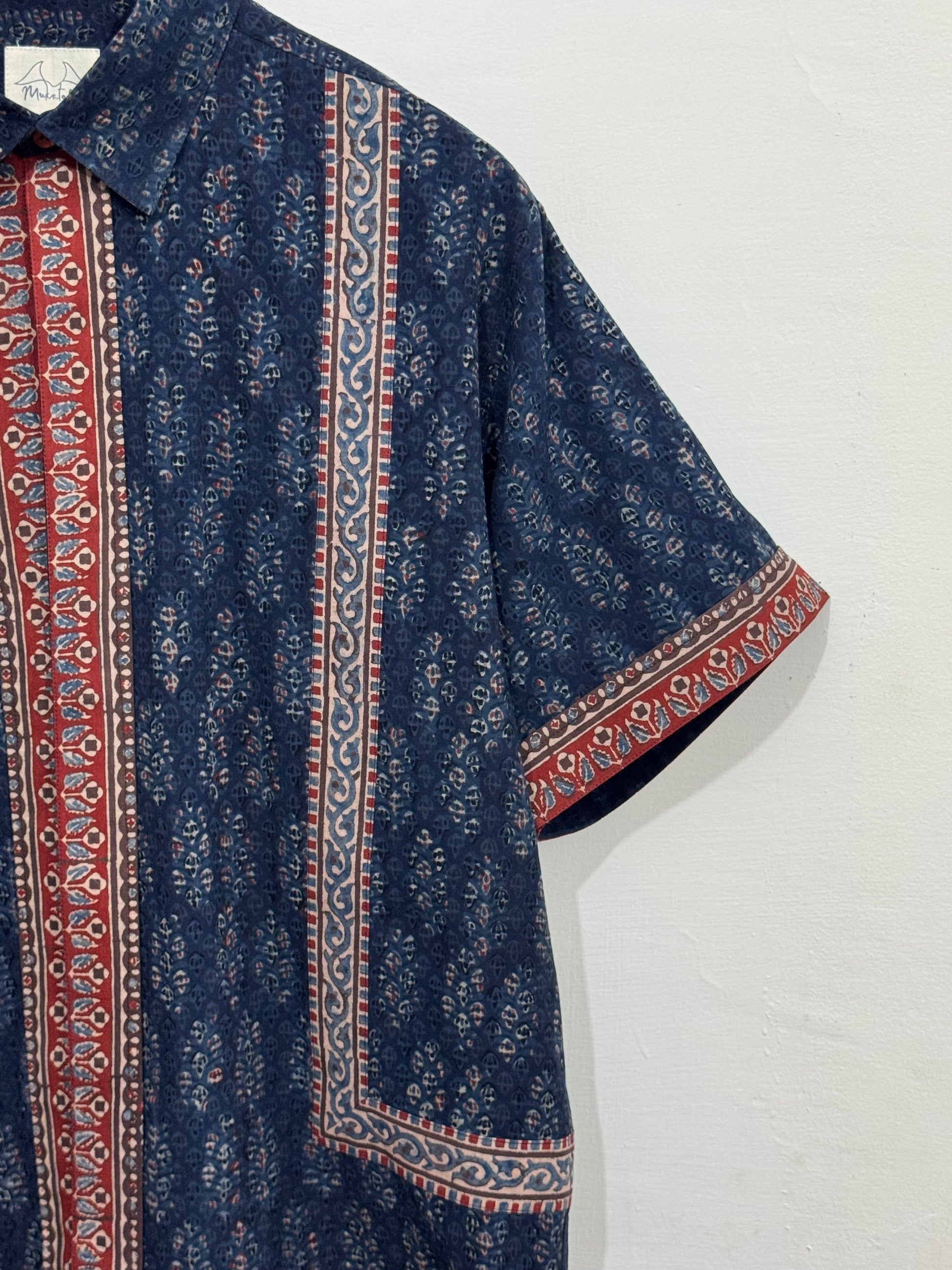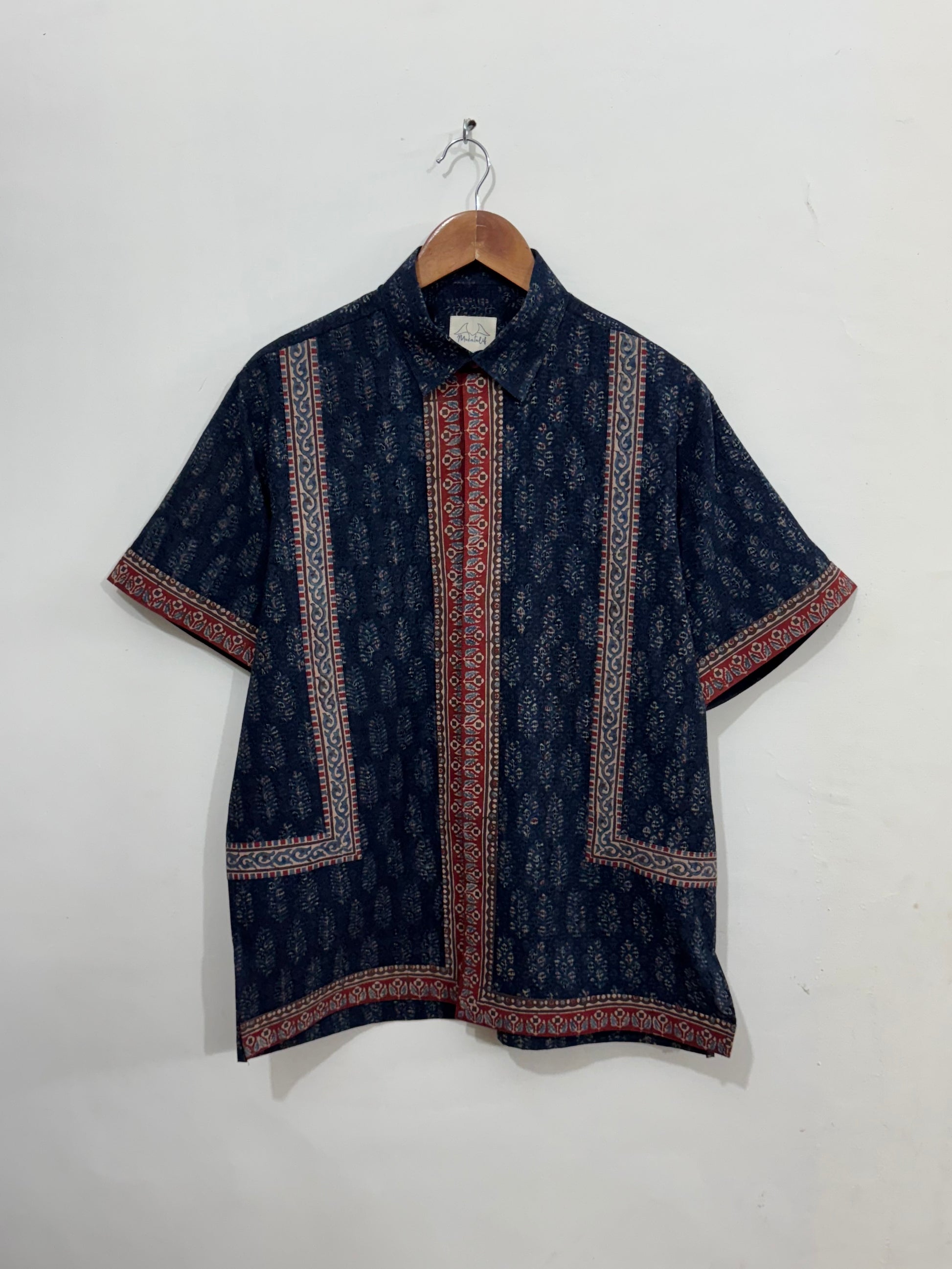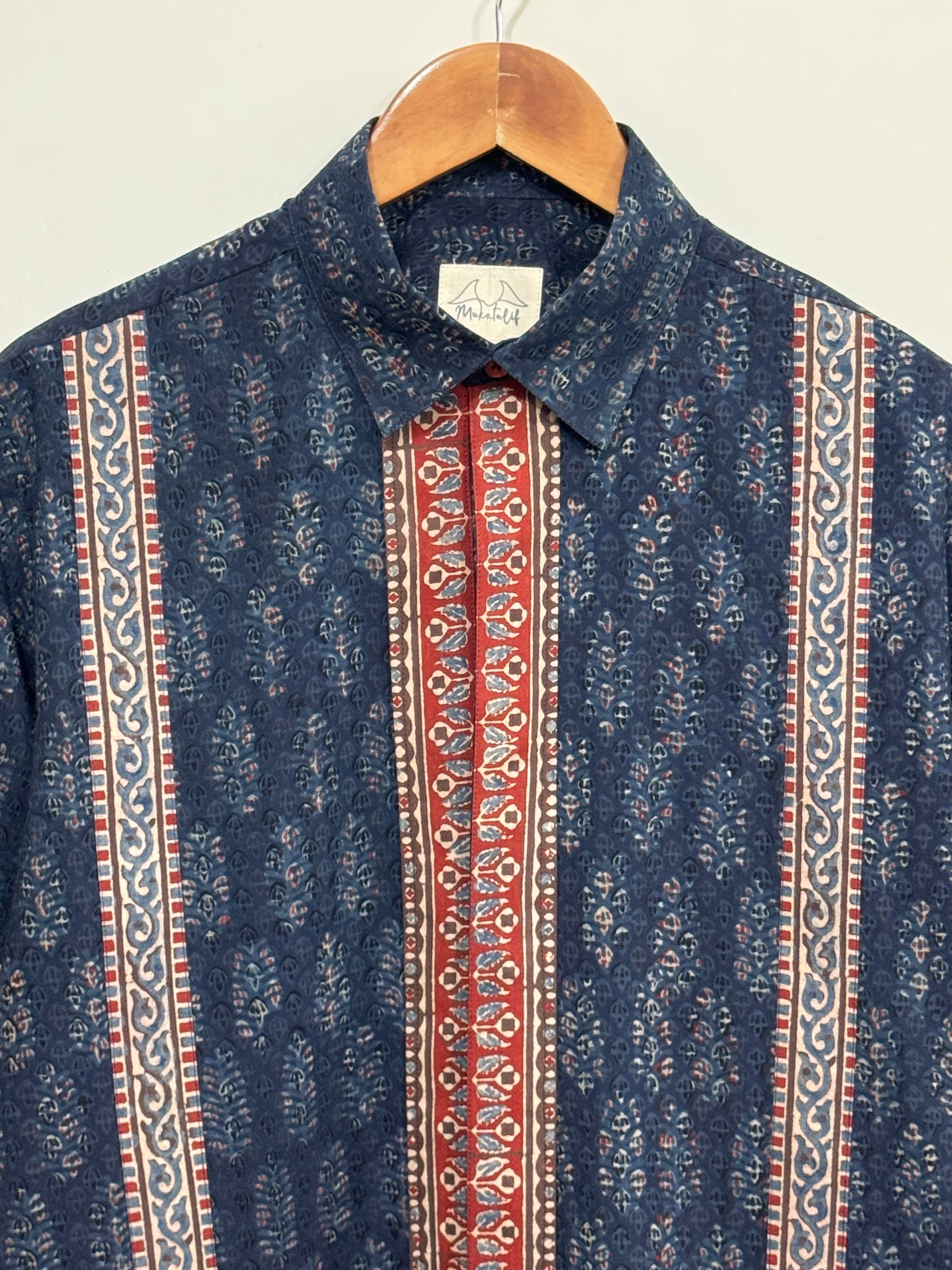 Introducing our exclusive “Ink & Earth” ajrakh shirt, featuring sophisticated border and piping detailing. The blue colour offers a unique and elegant backdrop, while the refined border and piping add a touch of modern distinction. Crafted from premium, soft cotton, this shirt ensures exceptional comfort and a sleek appearance. Its regular fit makes it perfect for every occasions. Elevate your wardrobe with this blend of classic color and contemporary detailing.