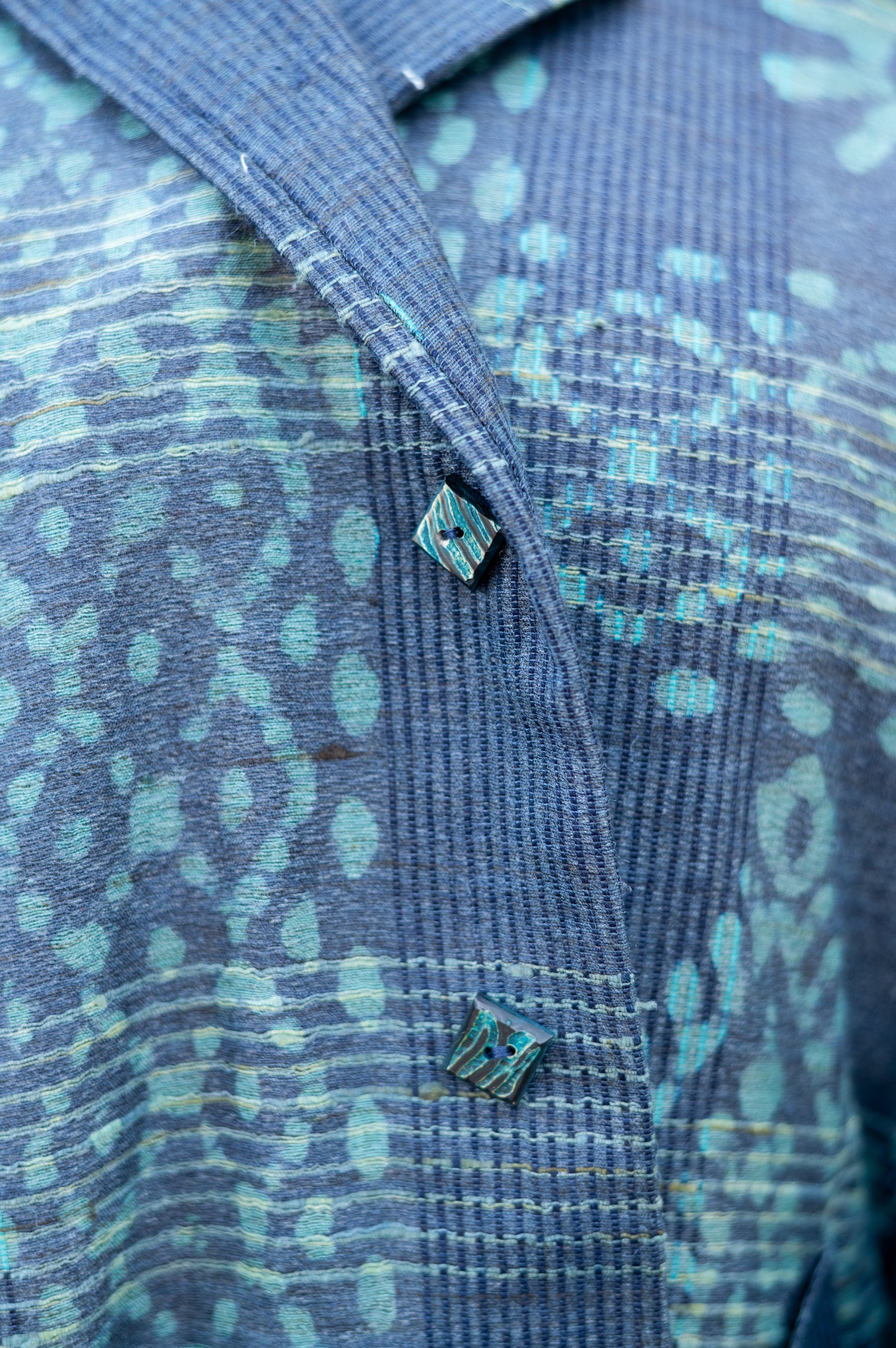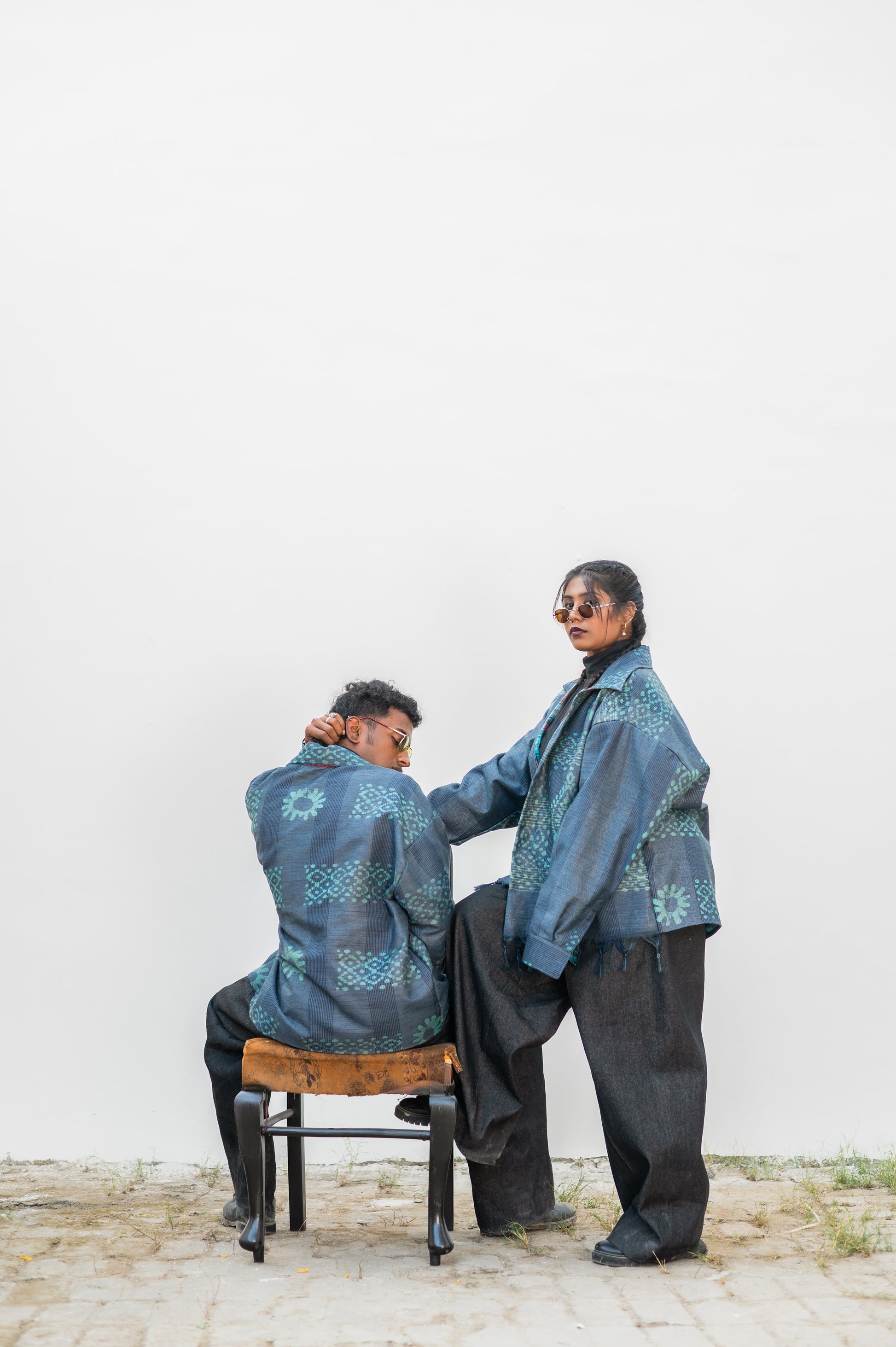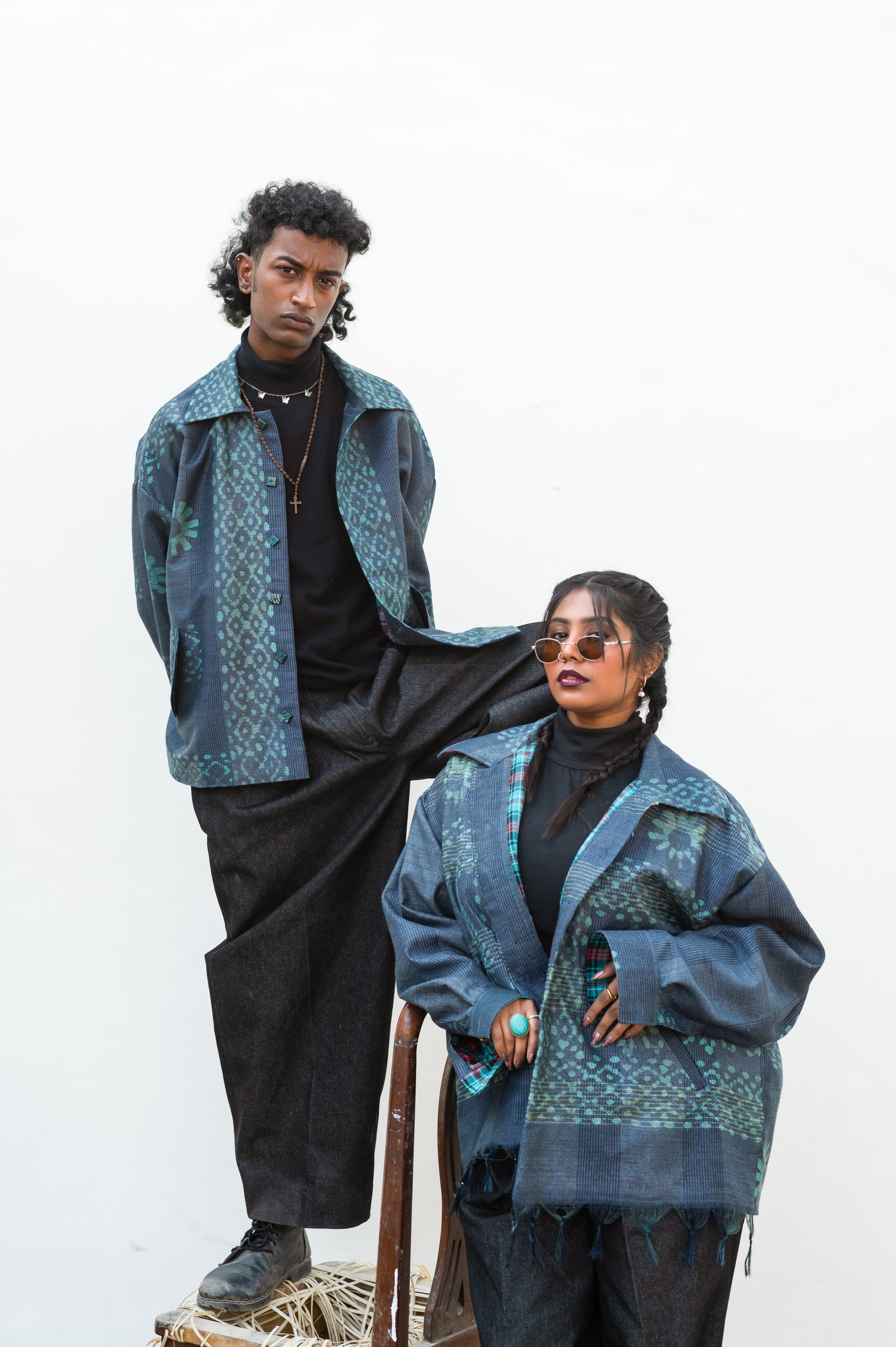 This one-of-a-kind shacket is a beautiful blend of creativity, sustainability, and timeless style, crafted from a repurposed saree. Its unique fabric showcases rich patterns and textures, celebrating heritage with a contemporary twist. Lined with soft flannel, it offers warmth perfect for light winters while ensuring all-day comfort. Thoughtfully designed with both inner and outer pockets, it combines practical functionality with artistic flair. The versatile fit allows effortless layering over casual or smart-casual outfits, making it a perfect companion for jeans, trousers, and tailored pants. A statement of conscious fashion, this shacket adds an element of individuality and elegance to your winter wardrobe.