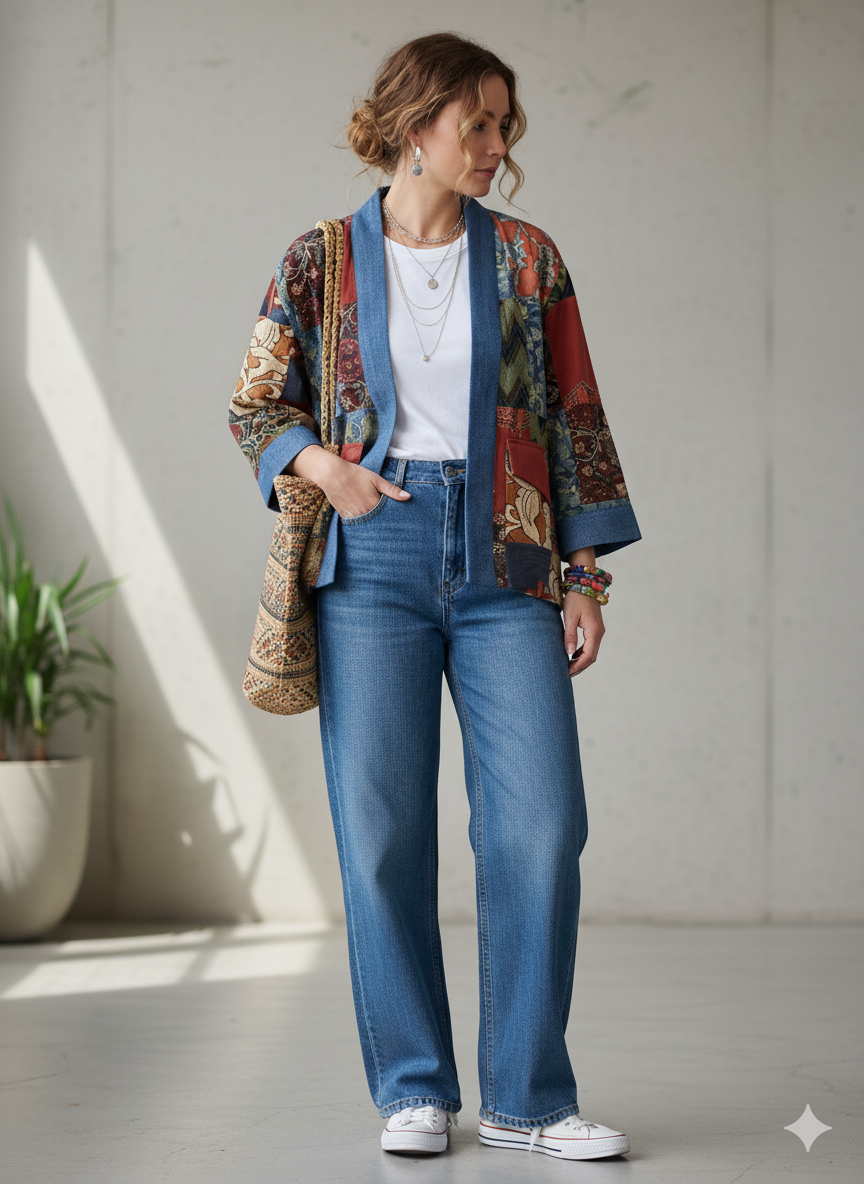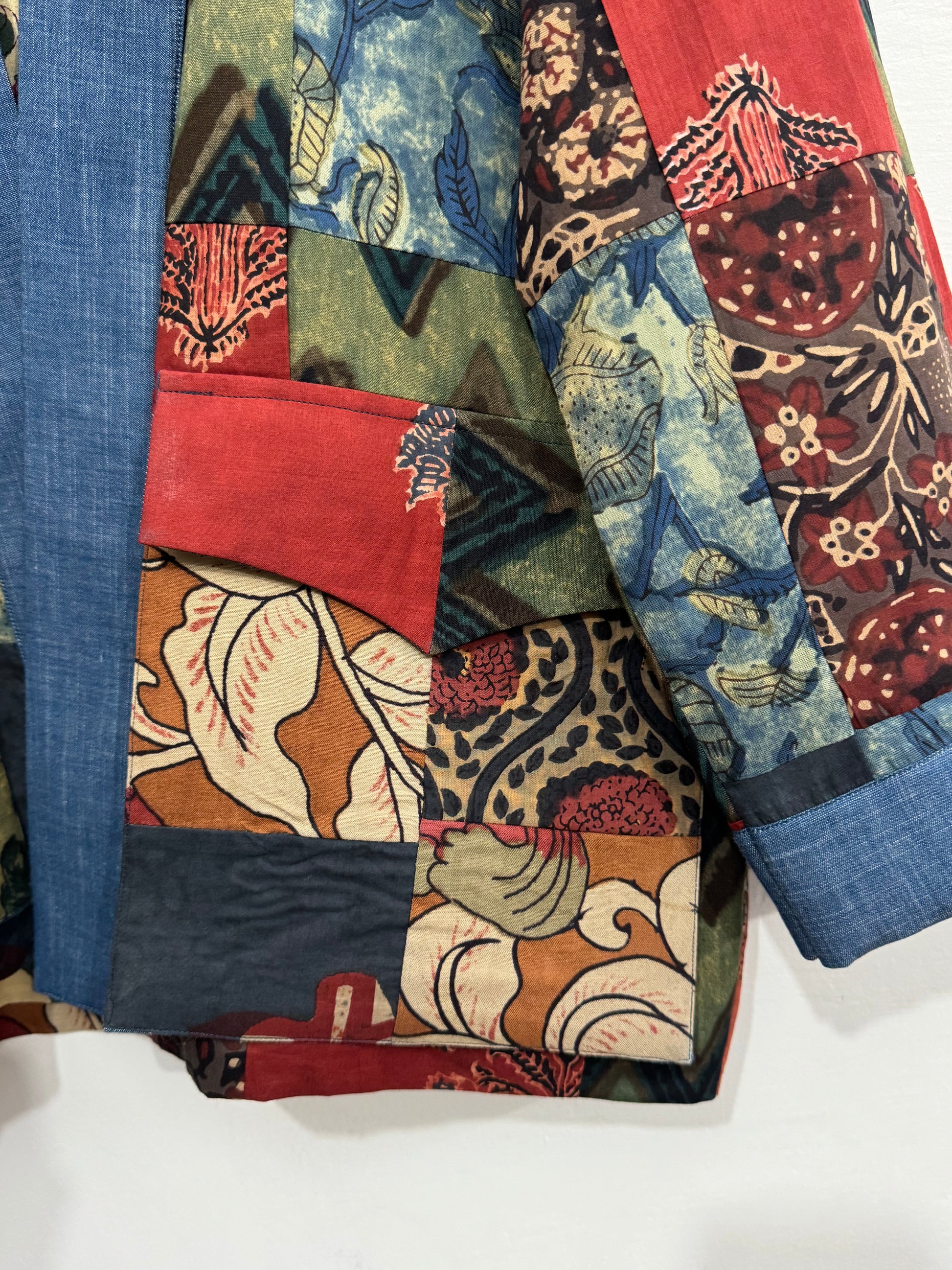 A statement piece that celebrates craftsmanship. This patchwork shrug is thoughtfully created from a mix of handpicked fabric panels, each carrying its own story. Every patch is carefully placed and hand-stitched, giving the shrug its unique character. Perfect to layer over a solid dress or basic outfit, it adds an effortless touch of art, texture, and individuality to your look.