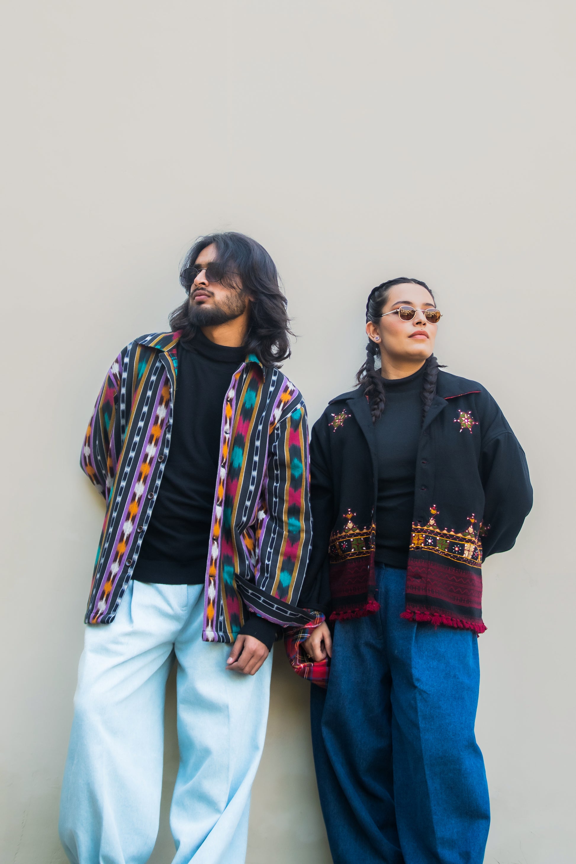 Our Patterned Shelter shacket is a stylish and functional addition to your winter wardrobe. Crafted from vibrant ikkat-print fabric, it boasts a rich blend of bold colors and geometric patterns for a striking look. Lined with soft flannel on the inside, it offers cozy warmth, perfect for light winters. Designed with a practical inner pocket, it combines utility with fashion-forward appeal. The relaxed fit allows for versatile styling—layer it over turtlenecks, basic tees, or even chunky knits for added warmth. Ideal for pairing with jeans or tailored pants, making it perfect for casual or smart-casual outfits. Whether buttoned up or worn open, it effortlessly elevates your layering game.