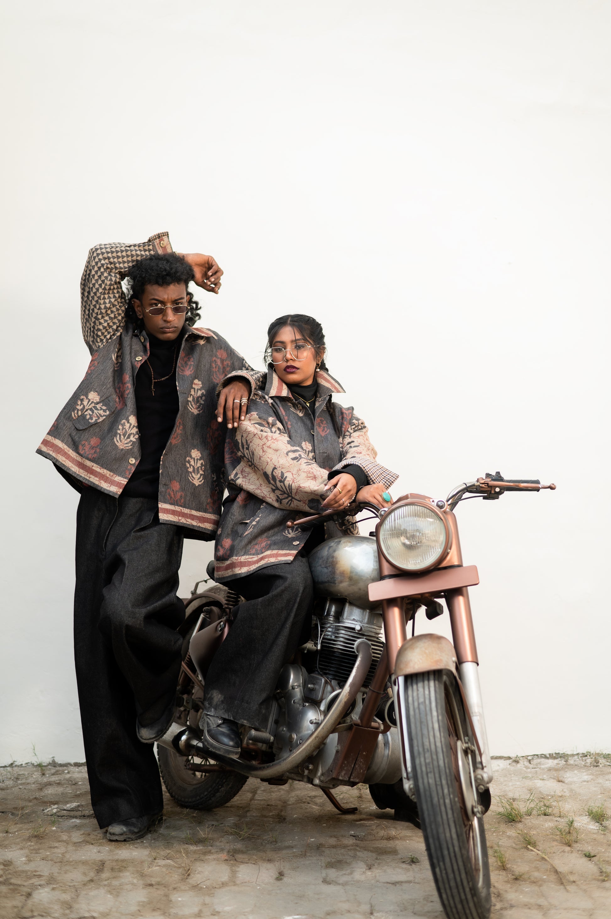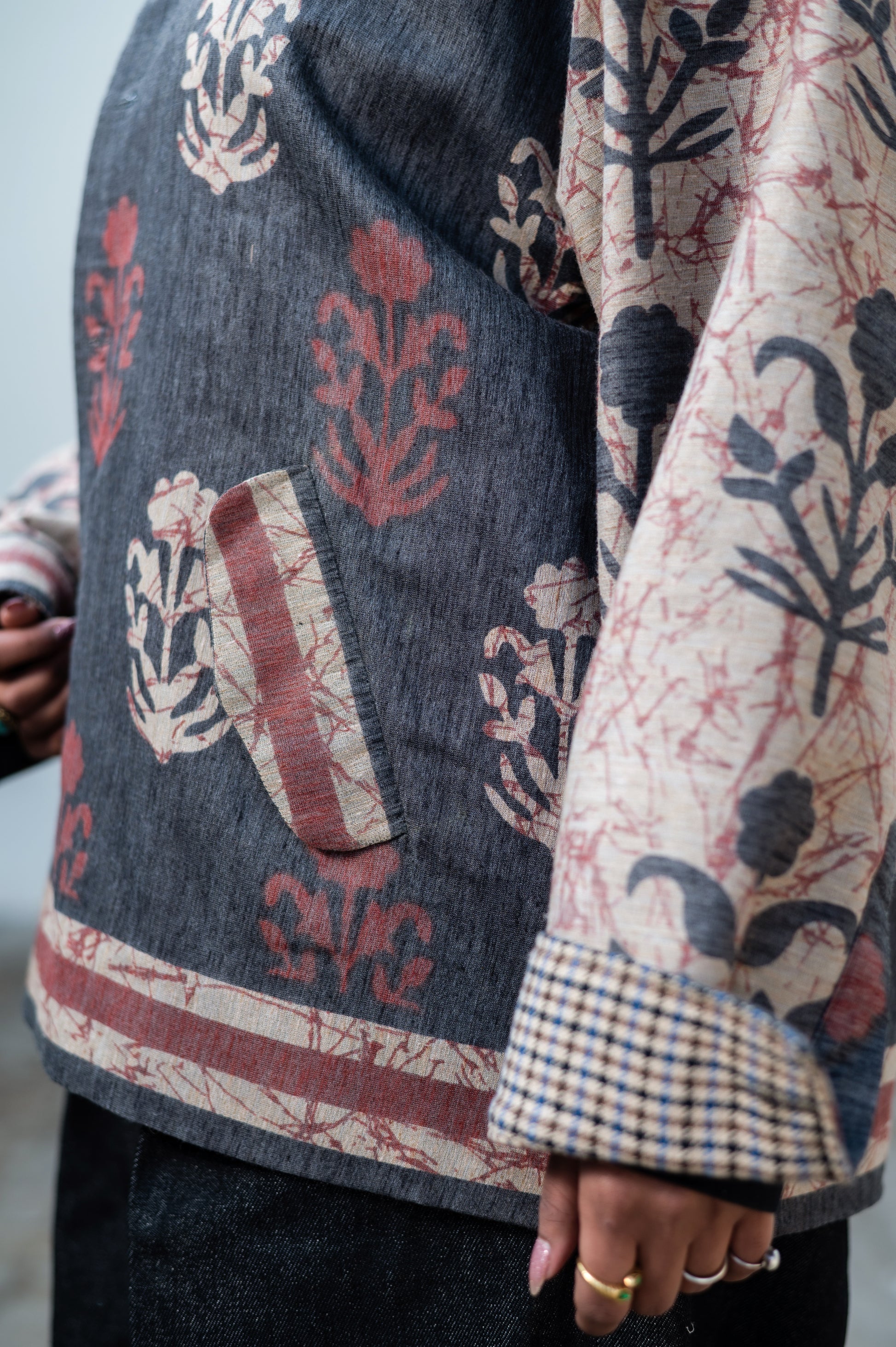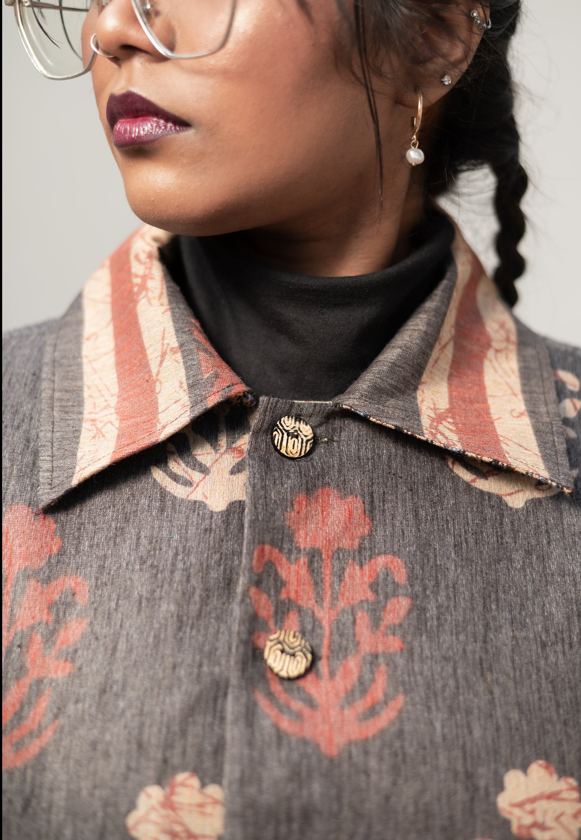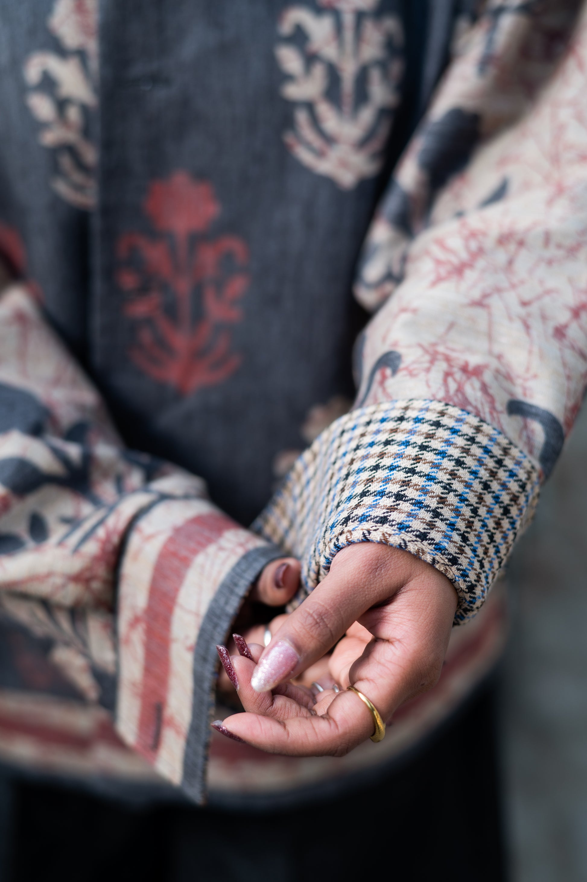 This one-of-a-kind shacket is a masterpiece of creativity and sustainability, thoughtfully crafted from a repurposed saree. Its unique fabric tells a story of tradition reimagined for modern fashion, with intricate patterns and textures that add a distinctive charm. Lined with soft flannel on the inside, it provides just the right amount of warmth for light winters while maintaining breathable comfort. Designed with both interior and exterior pockets, it offers practical functionality alongside its artistic appeal. The relaxed fit allows it to be effortlessly layered over a variety of tops, from casual tees to cozy turtlenecks. A perfect pairing with jeans or tailored trousers, this shacket is a stylish, eco-conscious choice that blends heritage with contemporary flair.