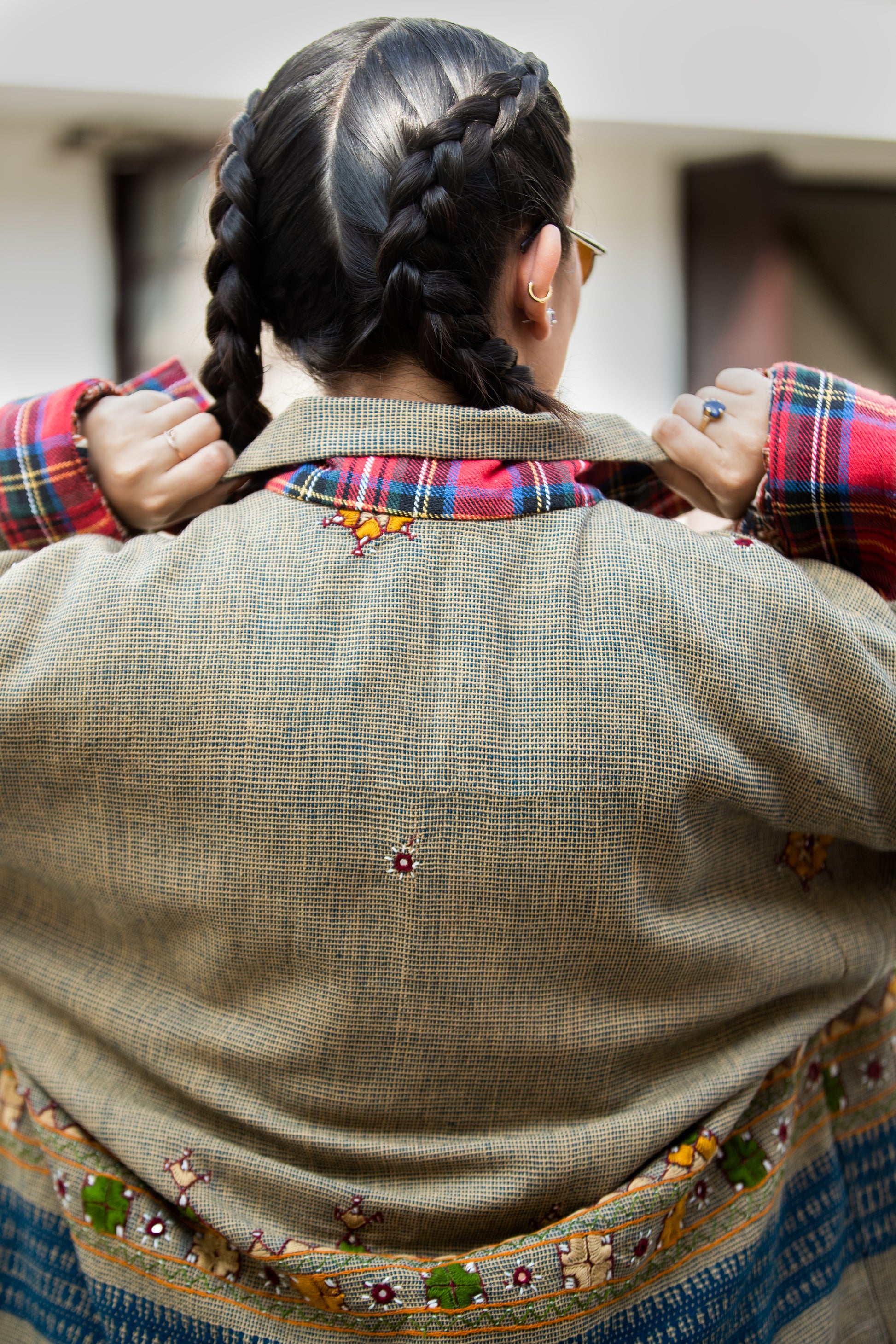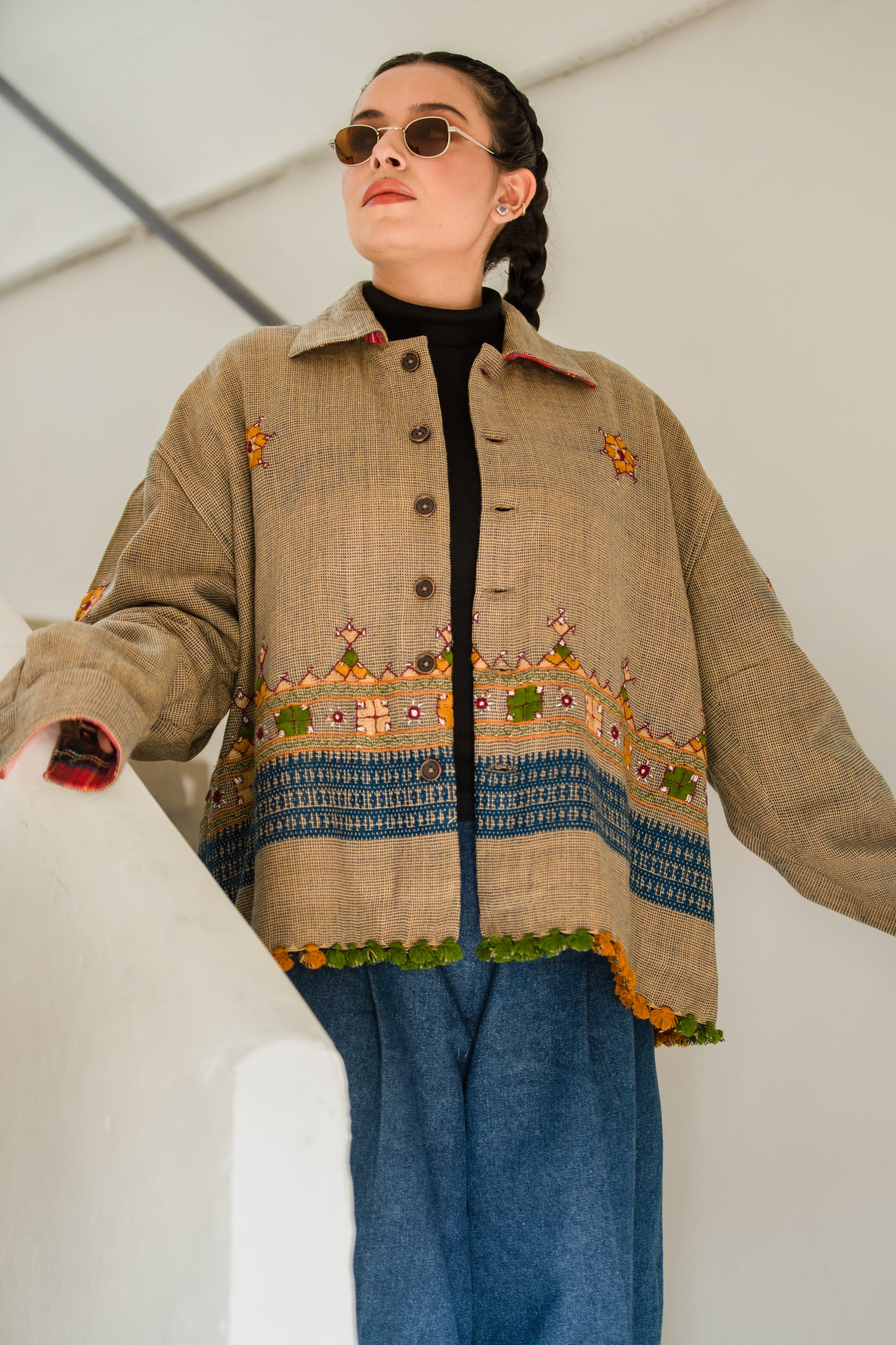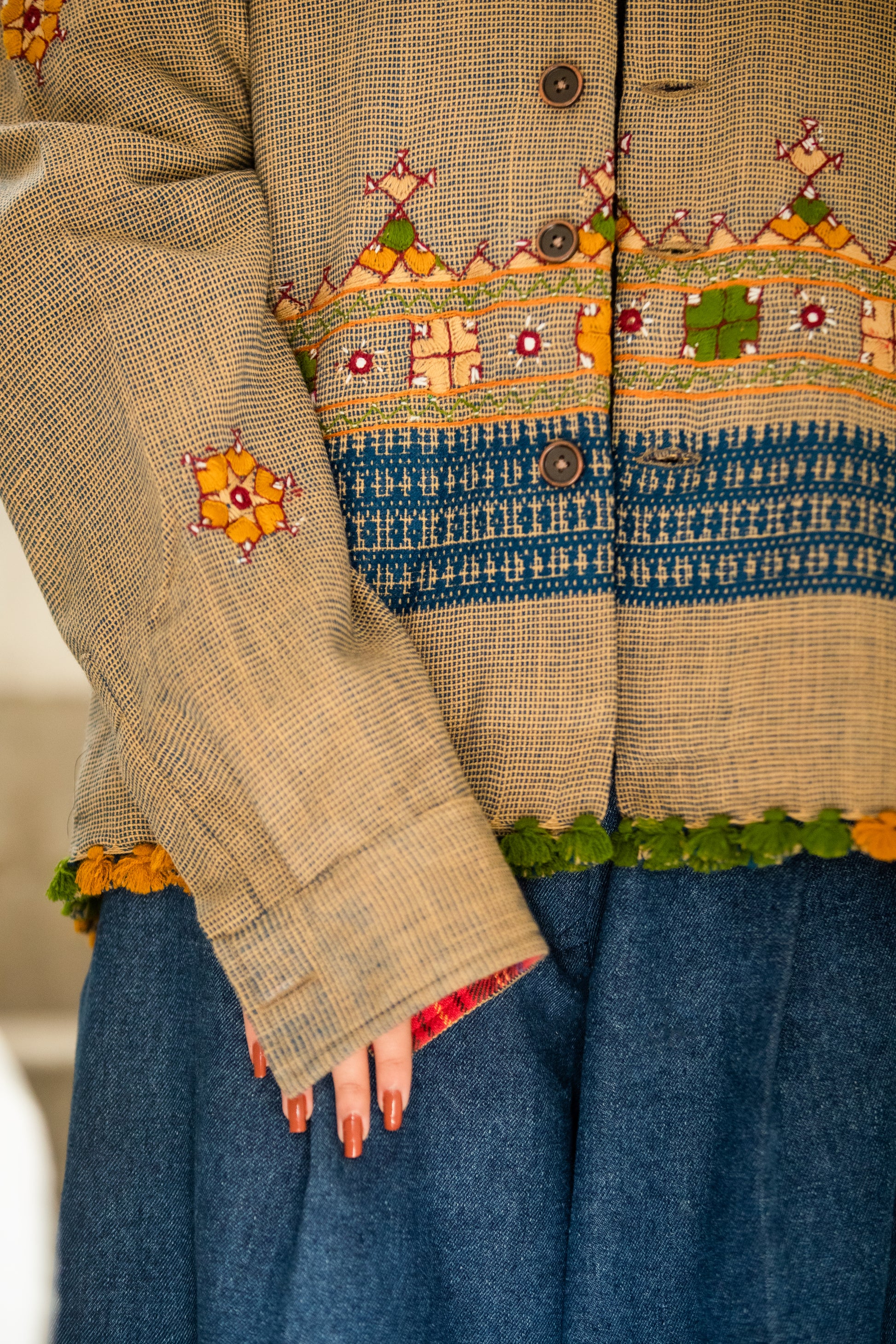 This one-of-a-kind shacket is a sophisticated blend of craftsmanship and comfort, designed for light winter layering. Lined with soft flannel on the inside, it offers just the right amount of warmth while remaining breathable. Intricate embroidery enhances its aesthetic appeal, adding a touch of artisanal charm. Featuring pockets, it provides ample storage for everyday essentials without compromising style. The versatile fit allows it to be layered effortlessly over turtlenecks, basic tees, or lightweight knits. Best styled with trousers or jeans. Whether worn buttoned up or left open, this shacket is a perfect blend of utility and timeless design, ideal for elevating your casual winter wardrobe.